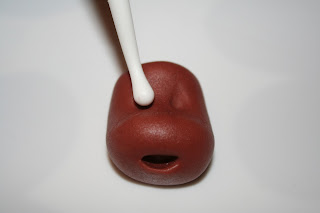 Så skal han rufses til… Jeg brukte en skalpell til dette, men du kan bruke en spiss kniv også. Stikk den inn og ta den litt opp så det blir litt rufs, ikke bare hull. Prøv gjerne på en kule med marsipan først så du får teknikken inn