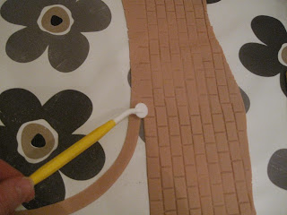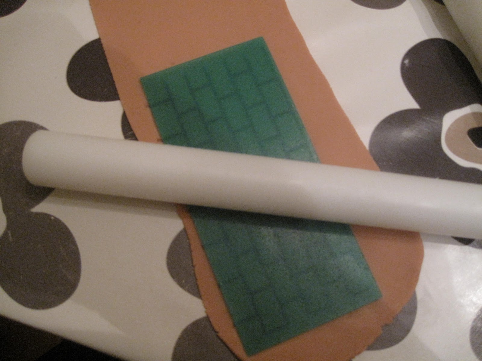 Den øverste skal være en kurv med nøster i, så da skal det være kurv mønster på siden av kaken. Jeg rakk ikke å få tak i kjevle med sånn kurvflette mønster så da ble det en enklere løsning… Jeg brukte en matte med mursteinsmønster, start med å kjevle en lang remse. Sett matten nedpå å bruk en rullepinne/kjevle for å prege inn mønsteret ordentlig