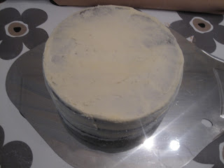 Jeg brukte litt av smørkremen for å «feste» kaken over i. Kan også bruke litt Royal Icing eller ferdig Icing. Kommer en mere detaljert innlegg om stablekaker senere…