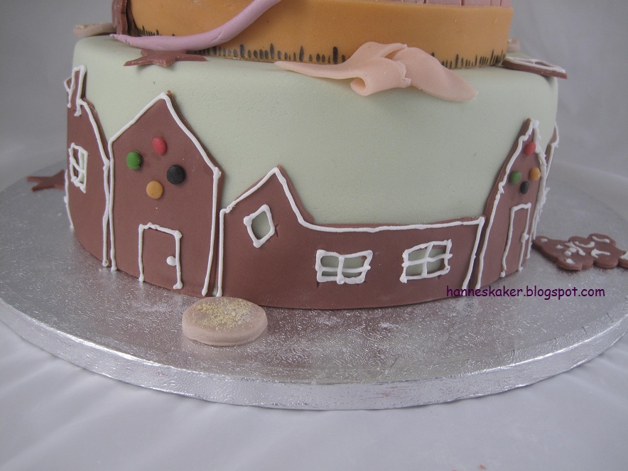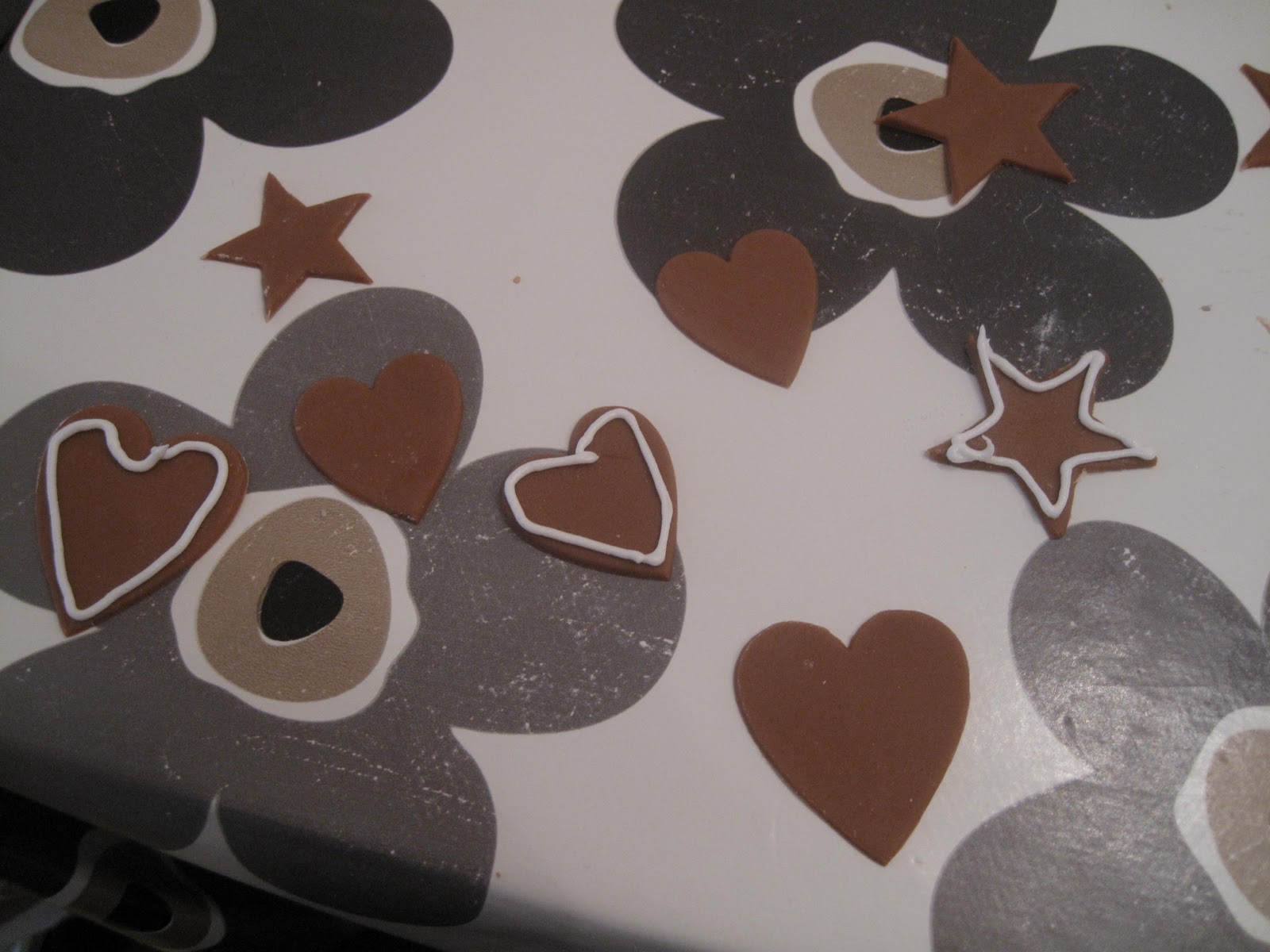 Så laget jeg litt pynt som skulle rundt omkring på kaken. Skjærte ut hus i forskjellige størrelser som skulle være pepperkakehus