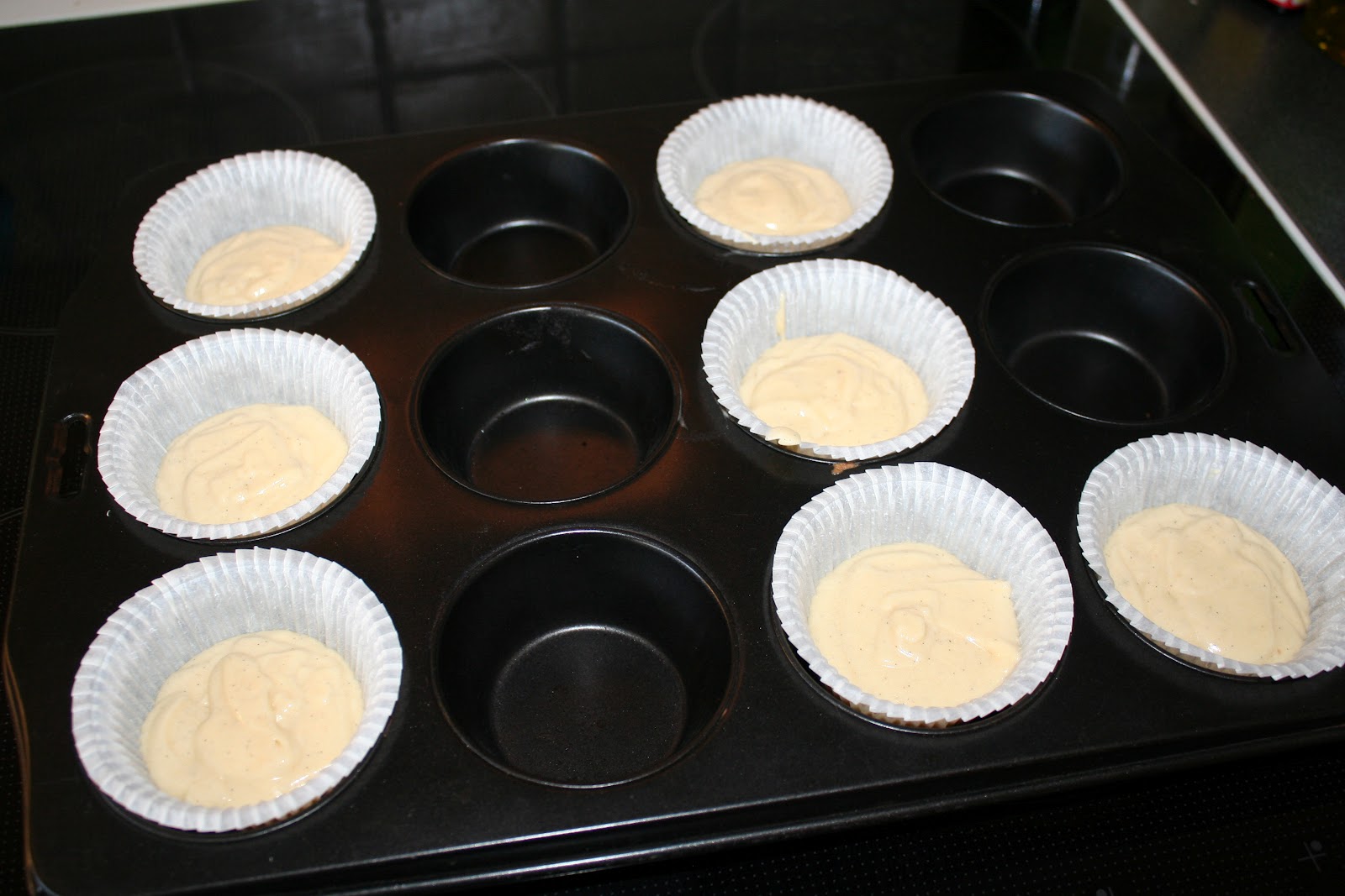 Fyll formene med røre halvfulle, ikke fyll mere for da renner de over…
