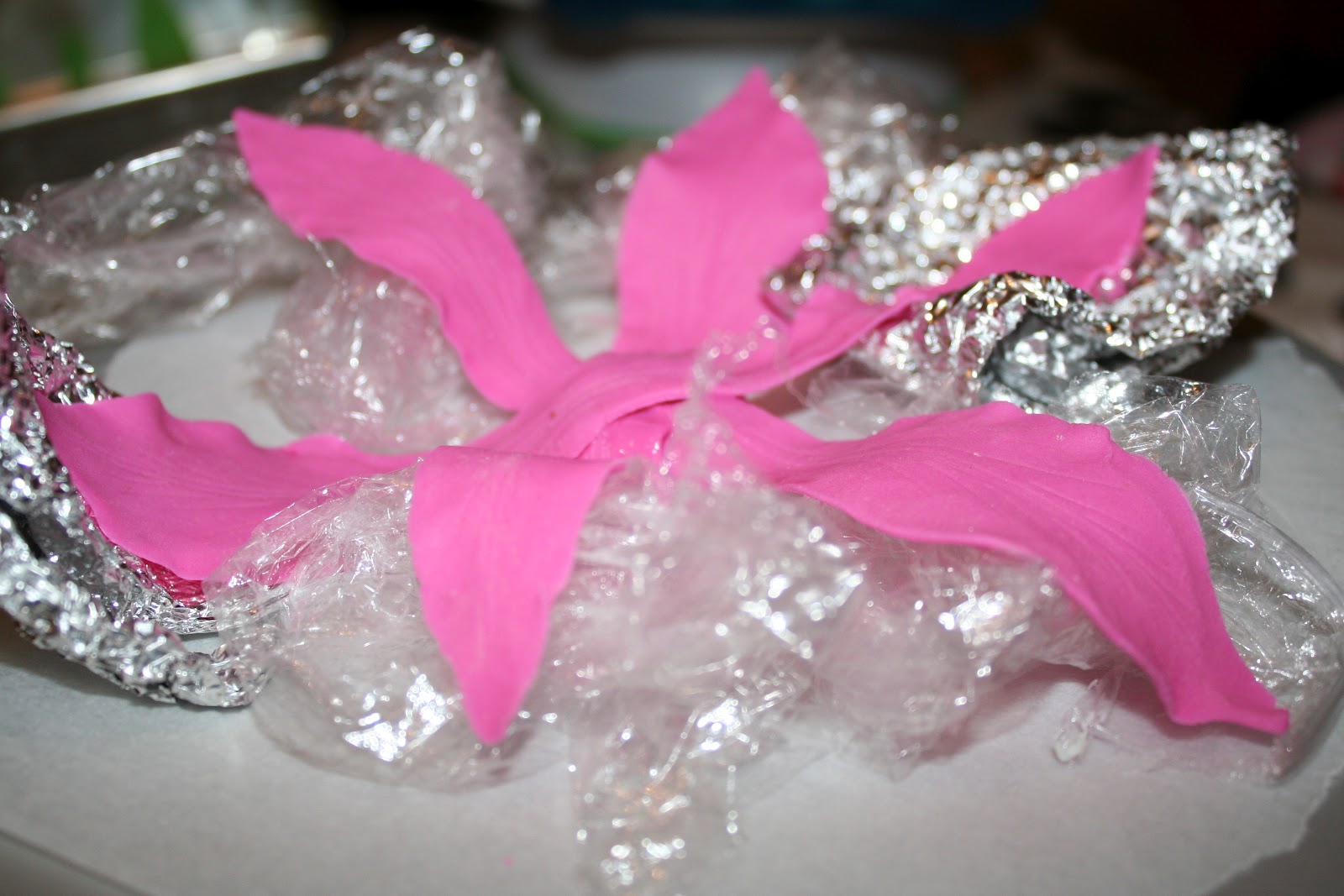 Blomsten er det lurt å lage noen dager i forveien, for den må tørke. Det samme med de grønne bladene rundt. Kan også være lurt å blande litt CMC eller Tylose i massen for da blir den stødigere og mere hold i.