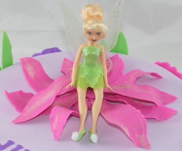 Blomsten bygget jeg opp med flere blader og litt små klumper marsipan imellom som støtte. Prøv å sette de marsipan klumpene så de ikke vises så godt. Men bruker man samme farge som blomsten så går det ganske greit… Penslet blomster bladene forsiktig med litt gull dust… Satte Julie sin Tingeling figur oppå 🙂