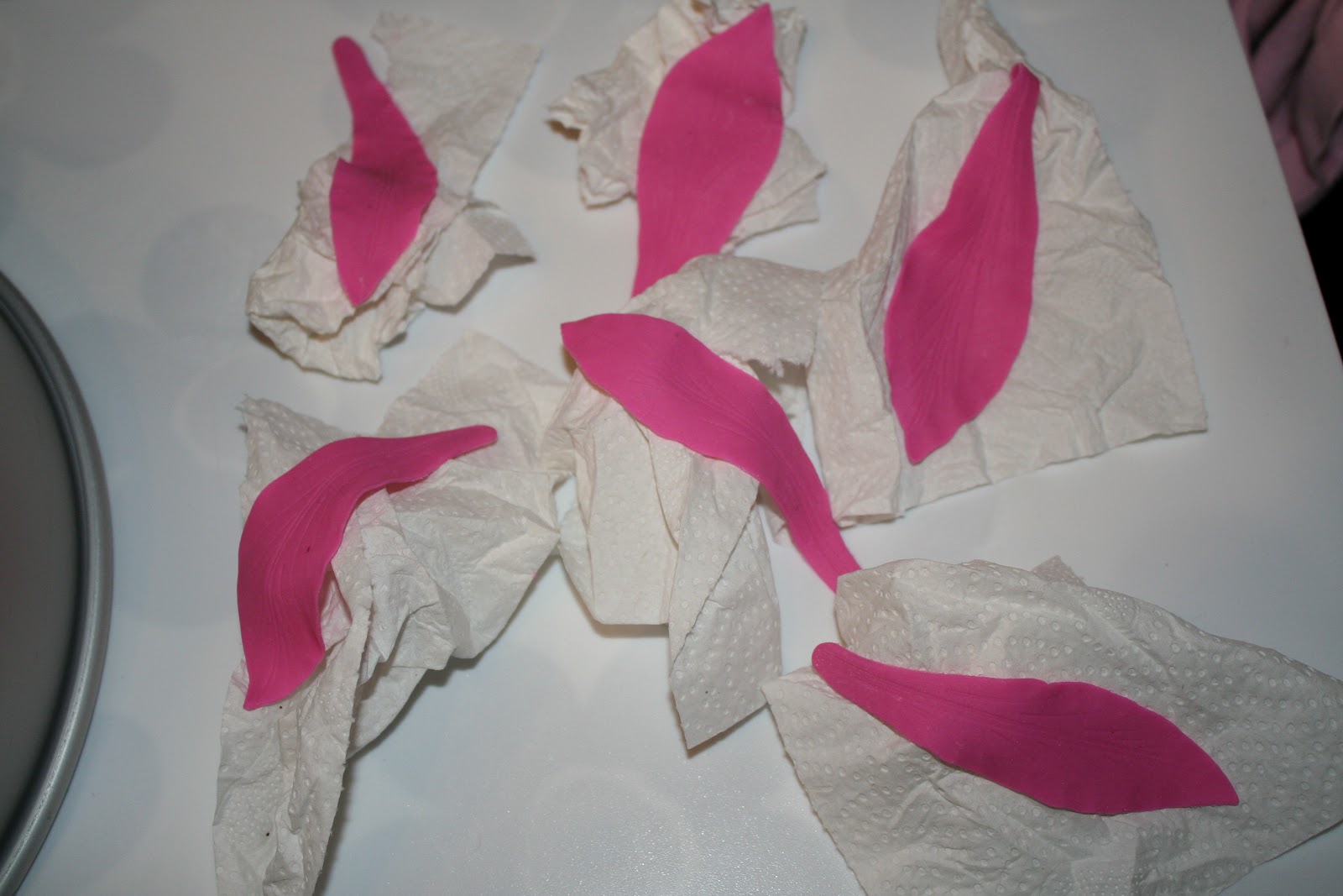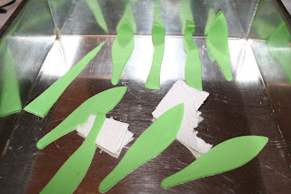 Jeg setter sammen noen blader til blomsten med engang så de tørker i fasong. Jeg la de oppå kakeformen på bakepapir for da så jeg hvordan den ble i størrelse. La en klump marsipan i midten og limte på blader med spiselig lim