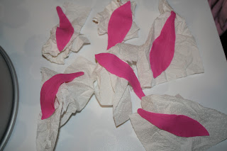 Jeg laget også noen blomster for å sette på siden av kaken. Brukte en sånn roseutstikker til blomsten