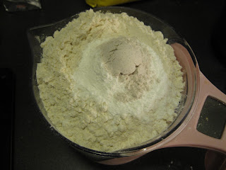 Så veies hvetemel og mål opp vaniljesukker og bakepulver. Anbefaler å bruke måleskje, det er så kjekt da blir det bestandig riktig