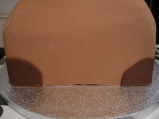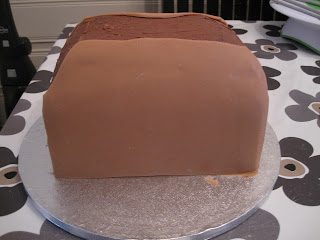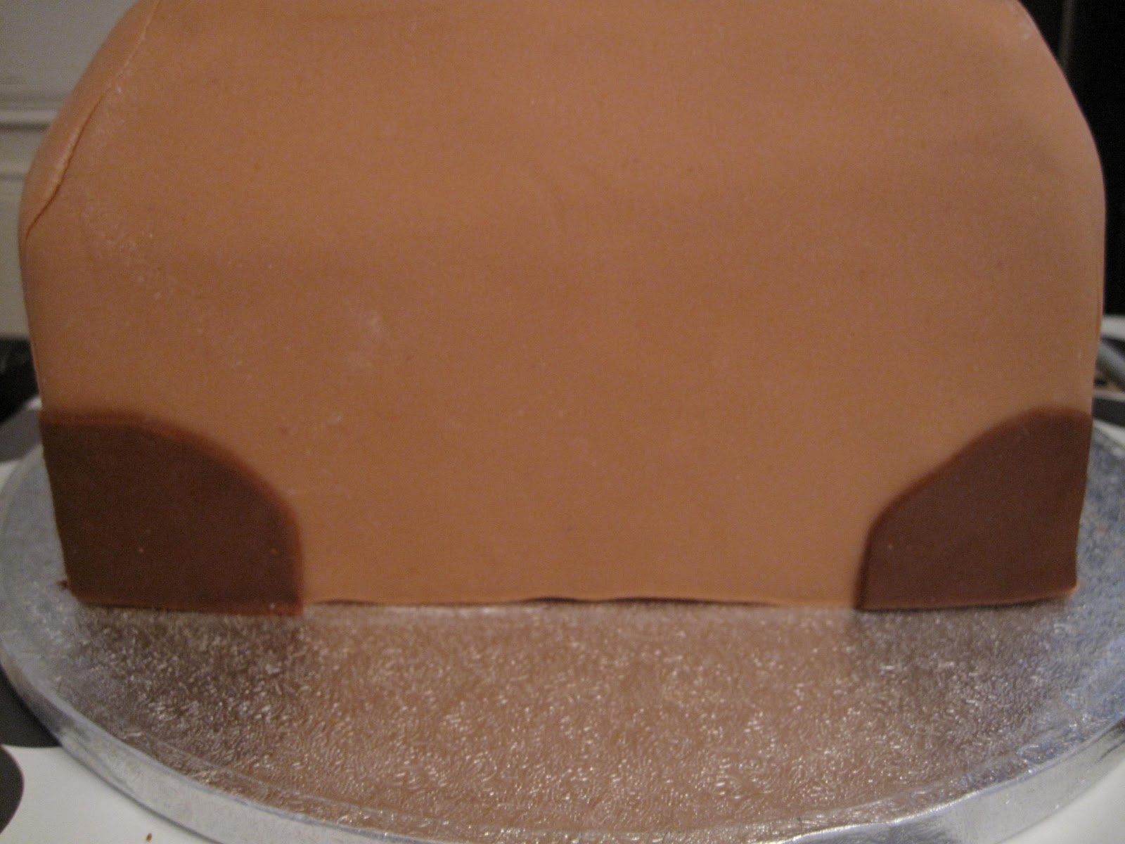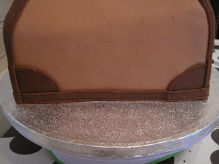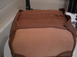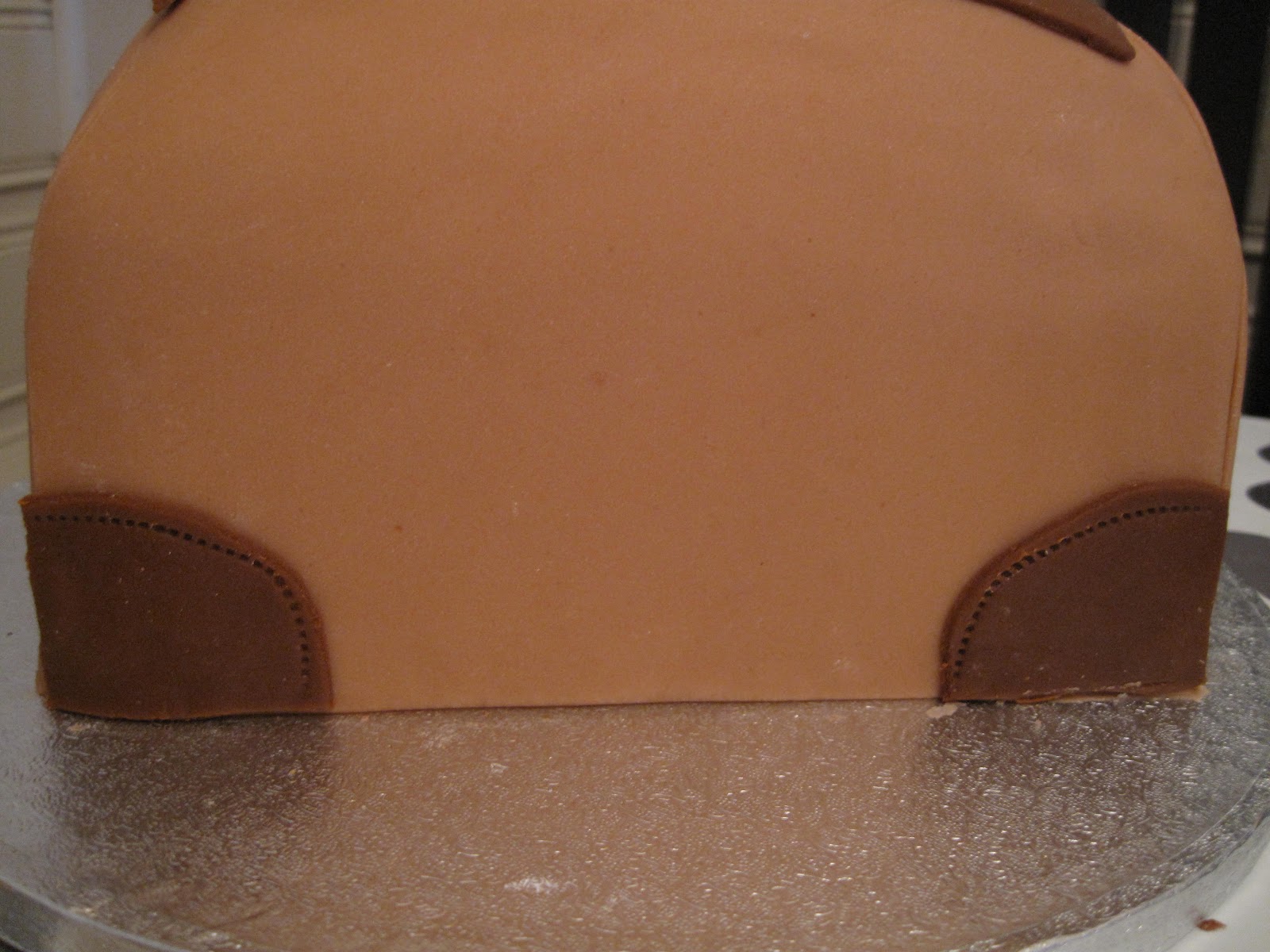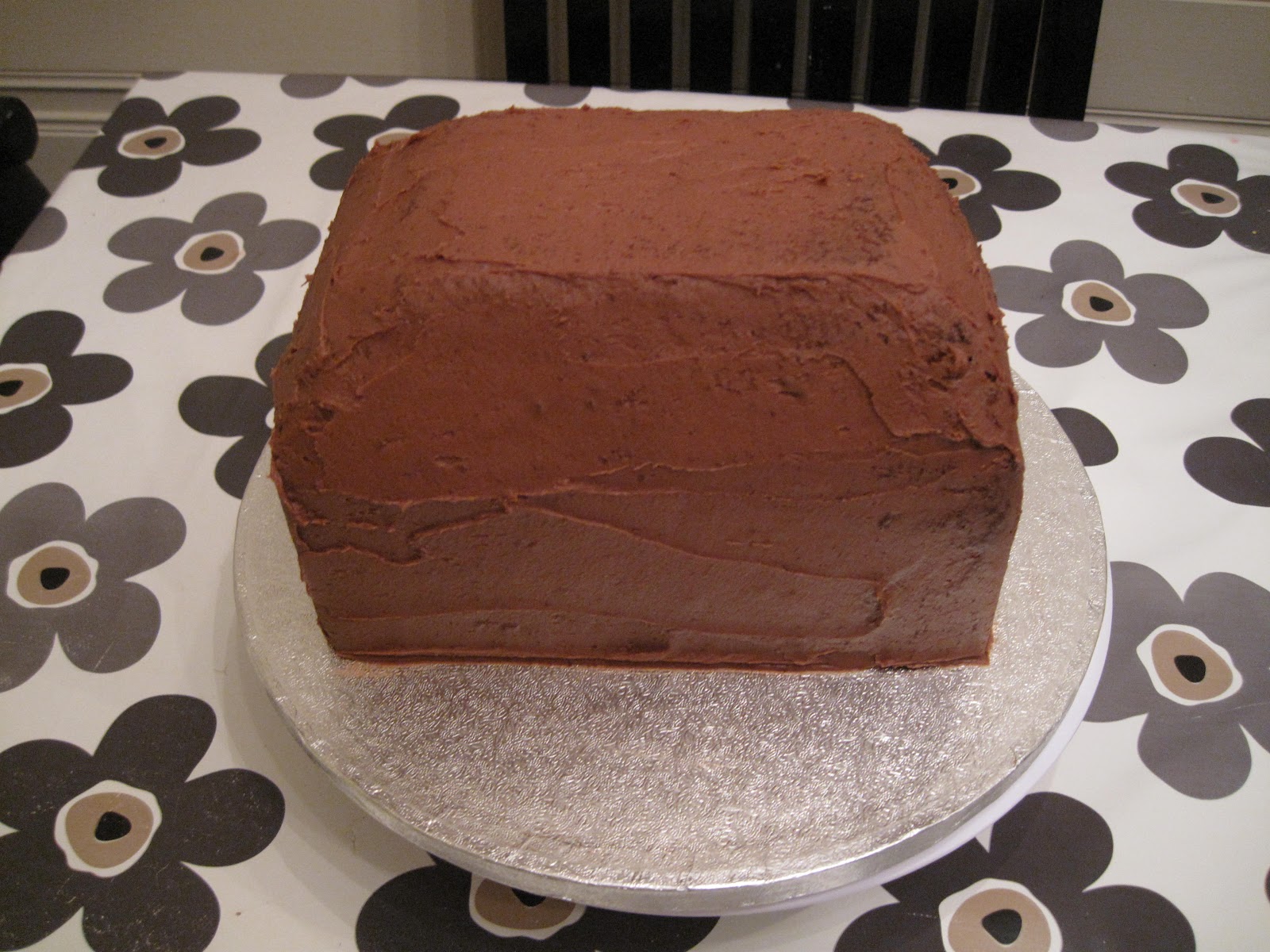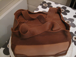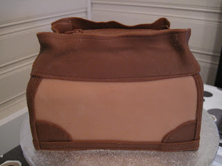 Smør opp kaken med sjokolade smørkrem. Nå ser vi veske fasongen bedre 😉
