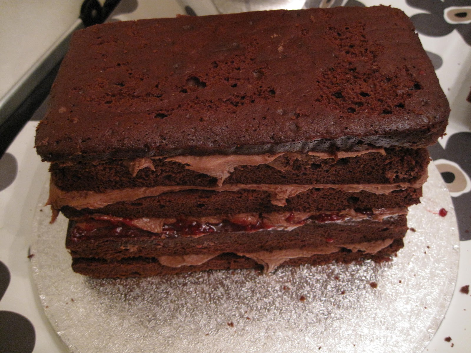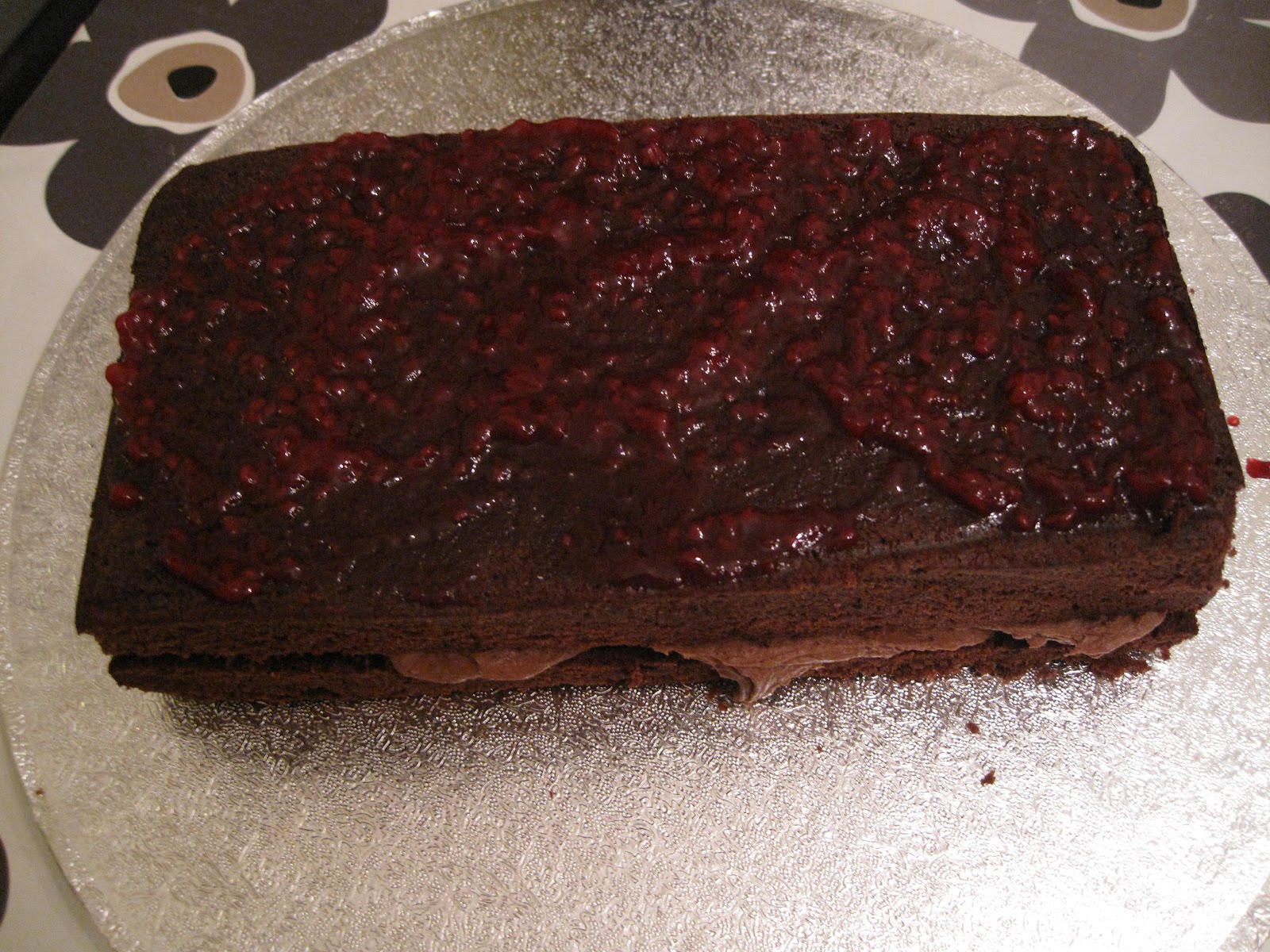 Dette ble en relativt stor kake. Jeg brukte 2 stk firkantet 22 cm sjokoladekaker, nærmere bestemt Annas favoritt sjokolade kake som du finner oppskrift på her. Inni er det sjokolade smørkrem og bringebær. Man kan lage den med mindre kake også…