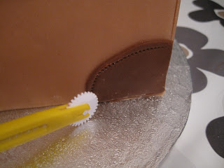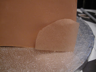 Skjær ut marsipan og dekk kortsiden med også. Gni over skjøtene med fingeren så de glir litt over i hverandre. De blir skjult av en remse litt senere så skjøten vises ikke…