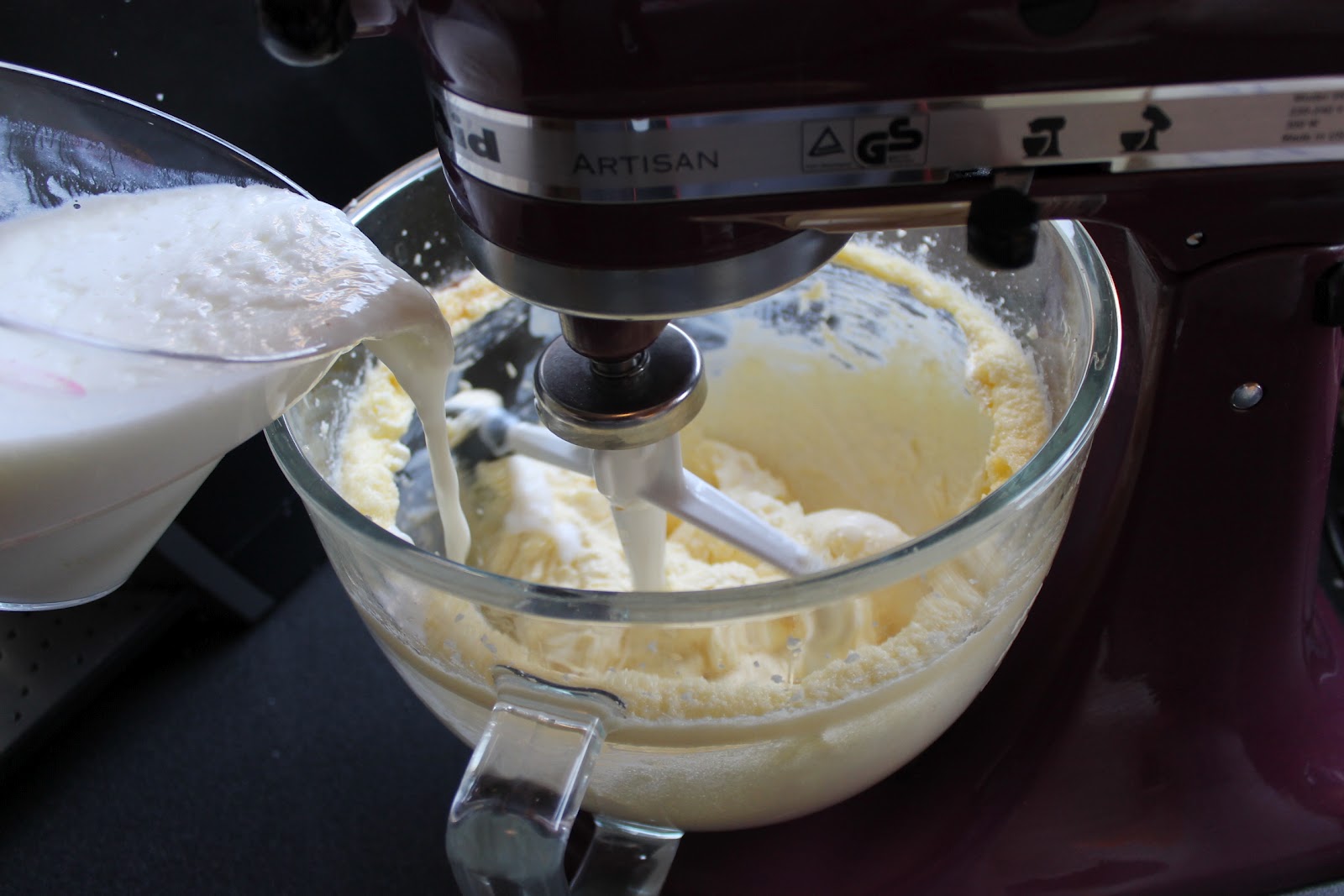 Så egg, skummet kulturmelk og vanilje ekstrakt. Kultur melken skal være romtemperert, sett den evt noen sekunder i micro hvis du ikke har husket å tatt den frem… Ha i eggene først og pisk godt