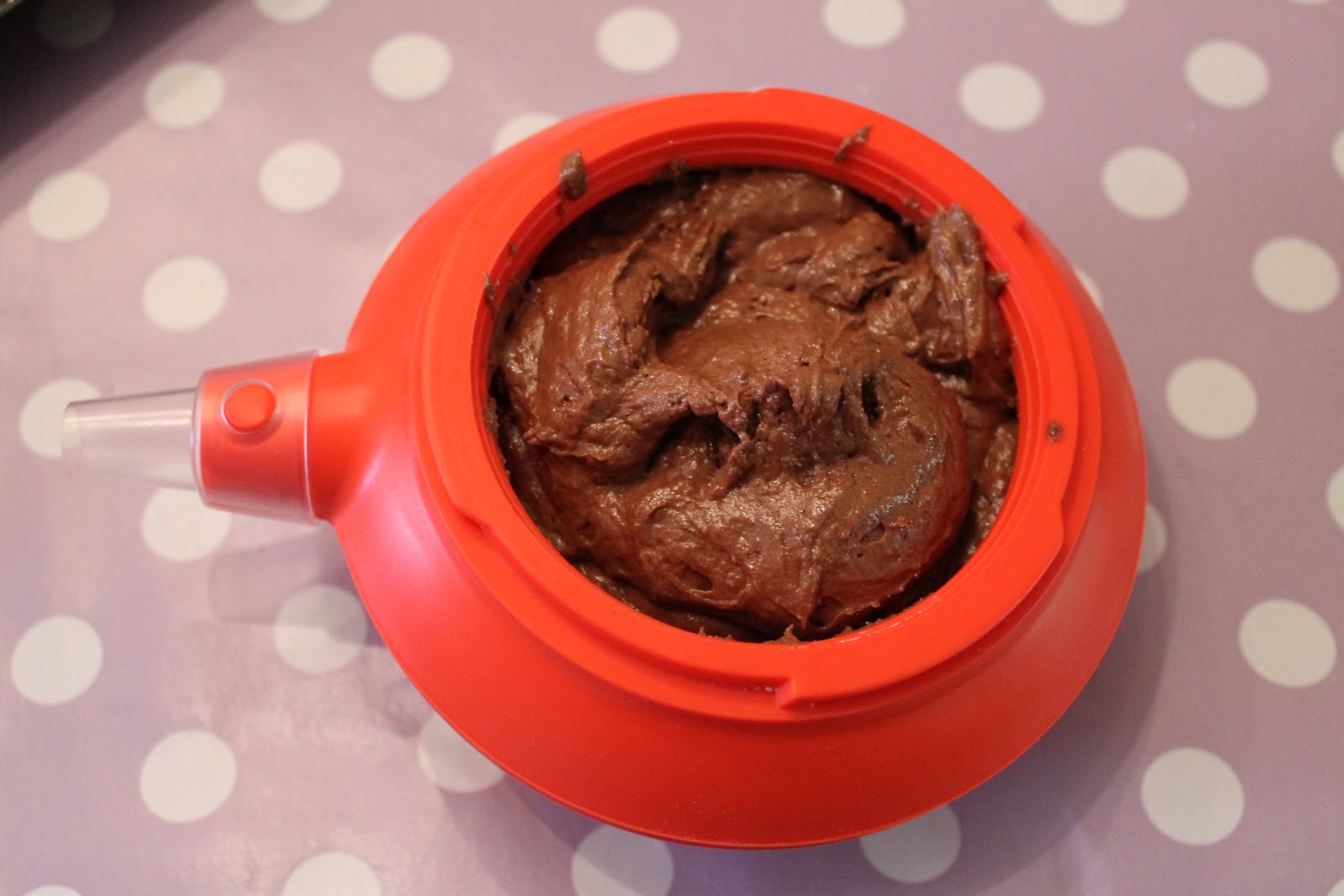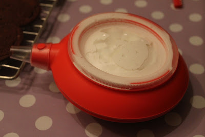 Hold Decomaxen med begge hender ( jeg måtte holde kameraet i en hånd også…). Klem ut med et jevnt trykk til den innerste ringen blir fylt, hold den i midten av ringen når du klemmer ut så Whoppie pien blir rund og fin