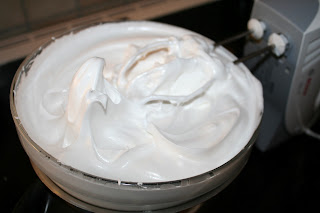 Etter 7 min er den ganske så stiv, men jeg pisket den noen minutt lengre. Det skal gå an å lage topper uten at de faller sammen. Da er den ferdig 🙂 Ta den bort fra kasserollen
