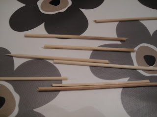 For å lage cakepops trenger man pinner, jeg fant selvfølgelig ikke igjen mine pinner…. Sånne pinner i papp får man kjøpt på enkelte Traktøren butikker og Panduro har også. Så da ble det sånne tre grill pinner delt opp i passende lengde (kunne vært litt lengre men…)