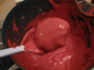Jeg brukte rød candy melts og tilsatte ca 1 ts Flott matfett