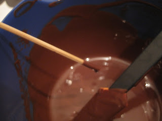 Så stikker du den inn i kulen og setter det kaldt igjen til sjokoladen stivner