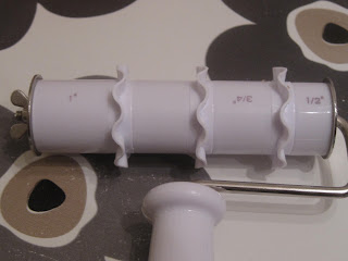 Du trenger flere strimler i samme bredde, veldig greit hvis du har et sånt verktøy (ribbon cutter). Med dette verktøyet kan man lage strimler på en enkel og grei måte. Bare å sette på de ulike ringene som følger med.