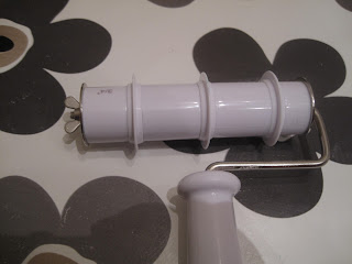 Til løkkene til sløyfen brukte jeg den det står 3/4 på dvs si ca 2 cm på disse, og lengden ca 14-15 cm. Er en fordel å sette på så mange som mulig, sånn som her sånn at man får 2 rader med strimler. Da får man et jevnt trykk på rullen hele veien. Jeg har brukt min litt mye til å lage bare en strimle om gangen og da er den blitt litt skjev…