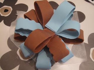 Så setter vi alt til tørk på et bakepapir, ha gjerne flere farger på sløyfen. Jeg lagde 20 stk og brukte 17 stk til min sløyfe. Alltid greit å lage for mange i tilfelle noen ikke blir så fine… Hvis marsipanen din er for myk så de bare synker sammen og ikke vil holde fasongen sånn så kan du snu løkken rette veien og legge f.eks. plastfolie inni som støtte. La disse stå å tørke i 2-3 dager gjerne lengre. Mine stod i underkant av 2 dager og det gikk faktisk bra…