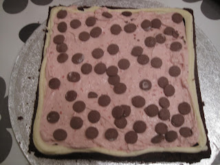 Jeg fyllte kaken med jordbærmousse (kommer trinn for trinn) og melkesjokladebiter. Unnskyld litt dårlig kvalitet på bildet…