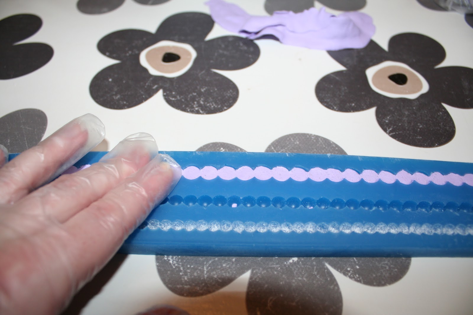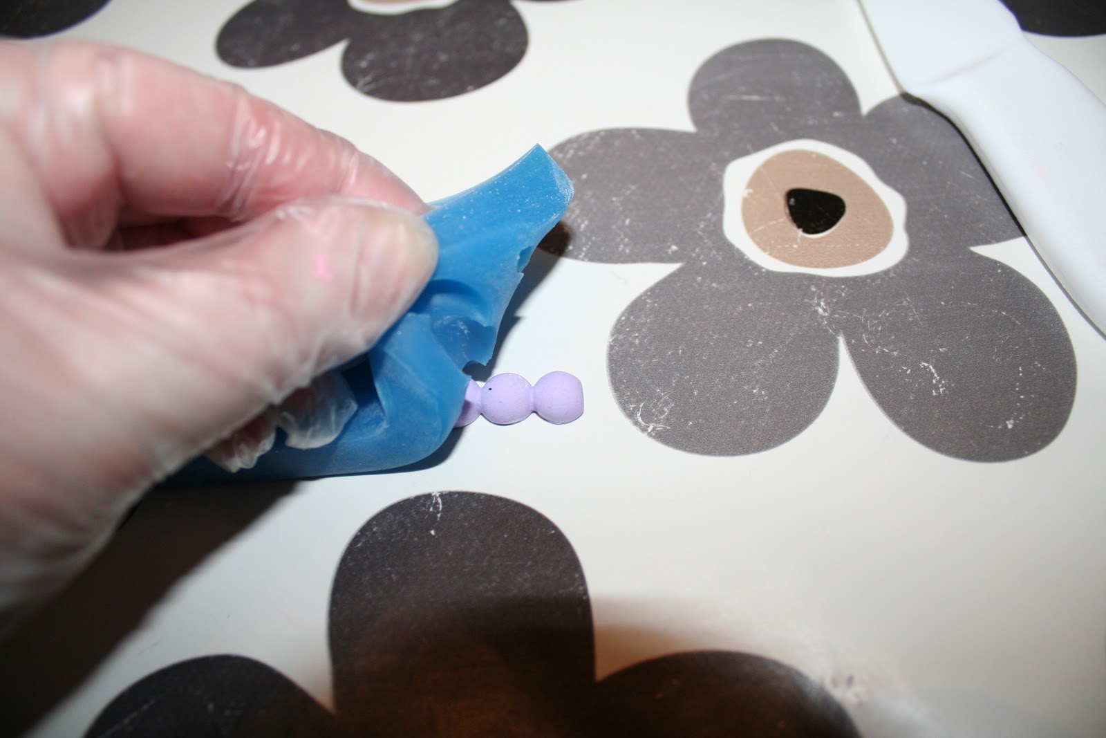 Bruk en plastkniv og skjær bort marsipanen kant i kant med formen. Ikke bruk en skarp kniv her for det kan skjære istykker formen…